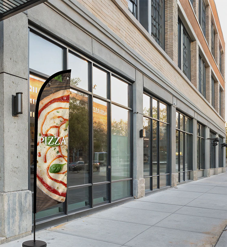 Cette feather flag “Pizza” au design réaliste met en avant une délicieuse pizza garnie, accompagnée du mot "PIZZA" en typographie blanche. Sobre et percutante, elle attire immédiatement l’œil des passants grâce à son visuel gourmand et sa lisibilité optimale.
